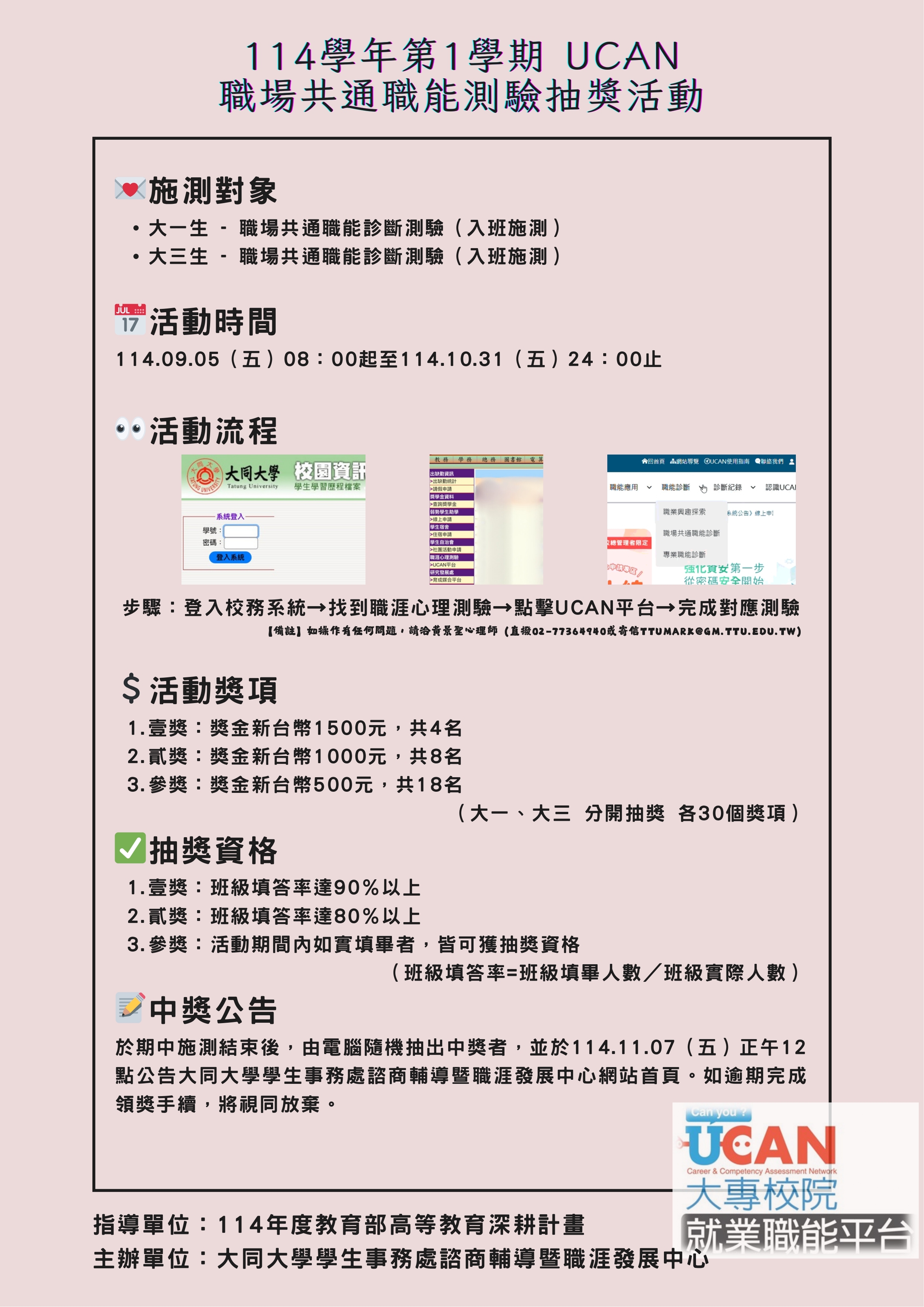 【活動訊息】114學年第1學期UCAN測驗抽獎活動!十分鐘就有機會抽到高額獎金喔!