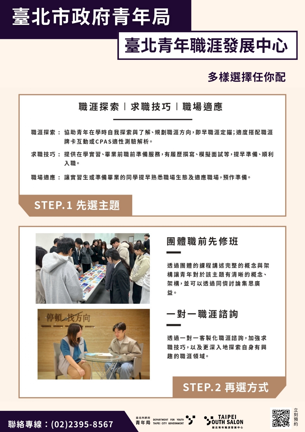 如有任何問題,歡迎聯繫臺北青年職涯發展中心,電話:(02)2395-8567。