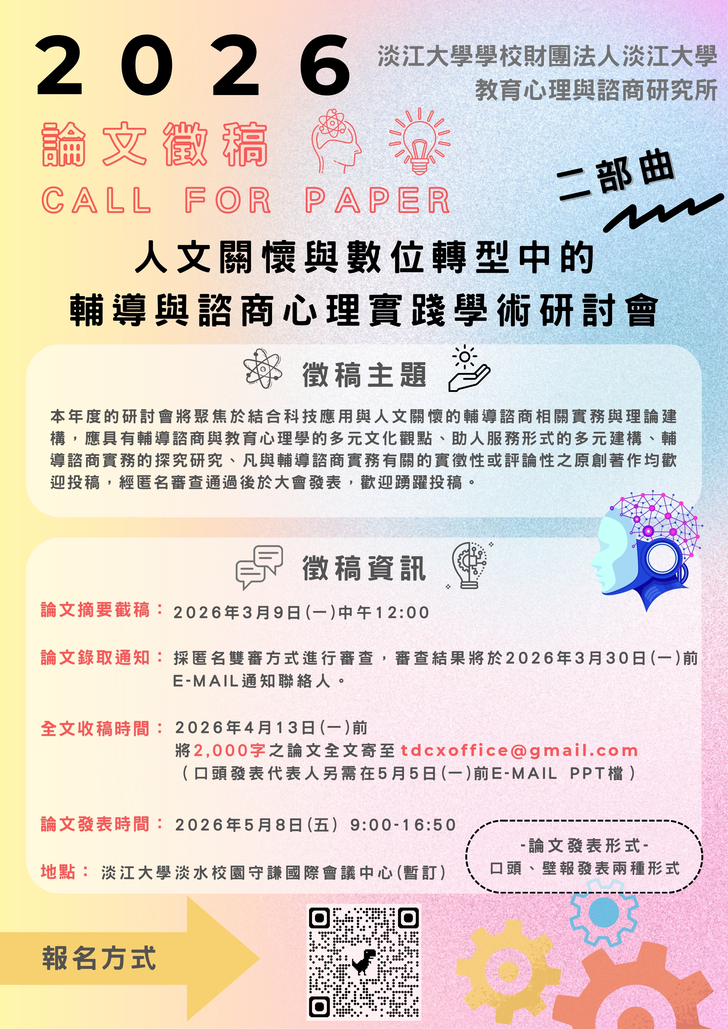 【活動訊息】淡江大學 - 115年5月8日(星期五)上午9時在淡水校園舉辦「2026人文關懷與數位轉型中的輔導與諮商心理實踐學術研討會:二部曲」