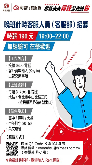 iRent|和雲行動服務股份有限公司招募晚班計時客服人員(客服部)