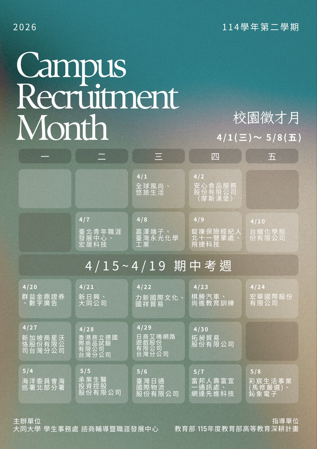【活動訊息】115年校園徵才月開跑!歡迎同學們踴躍參與,積極了解市場需求!(駐地廠商持續更新中)
