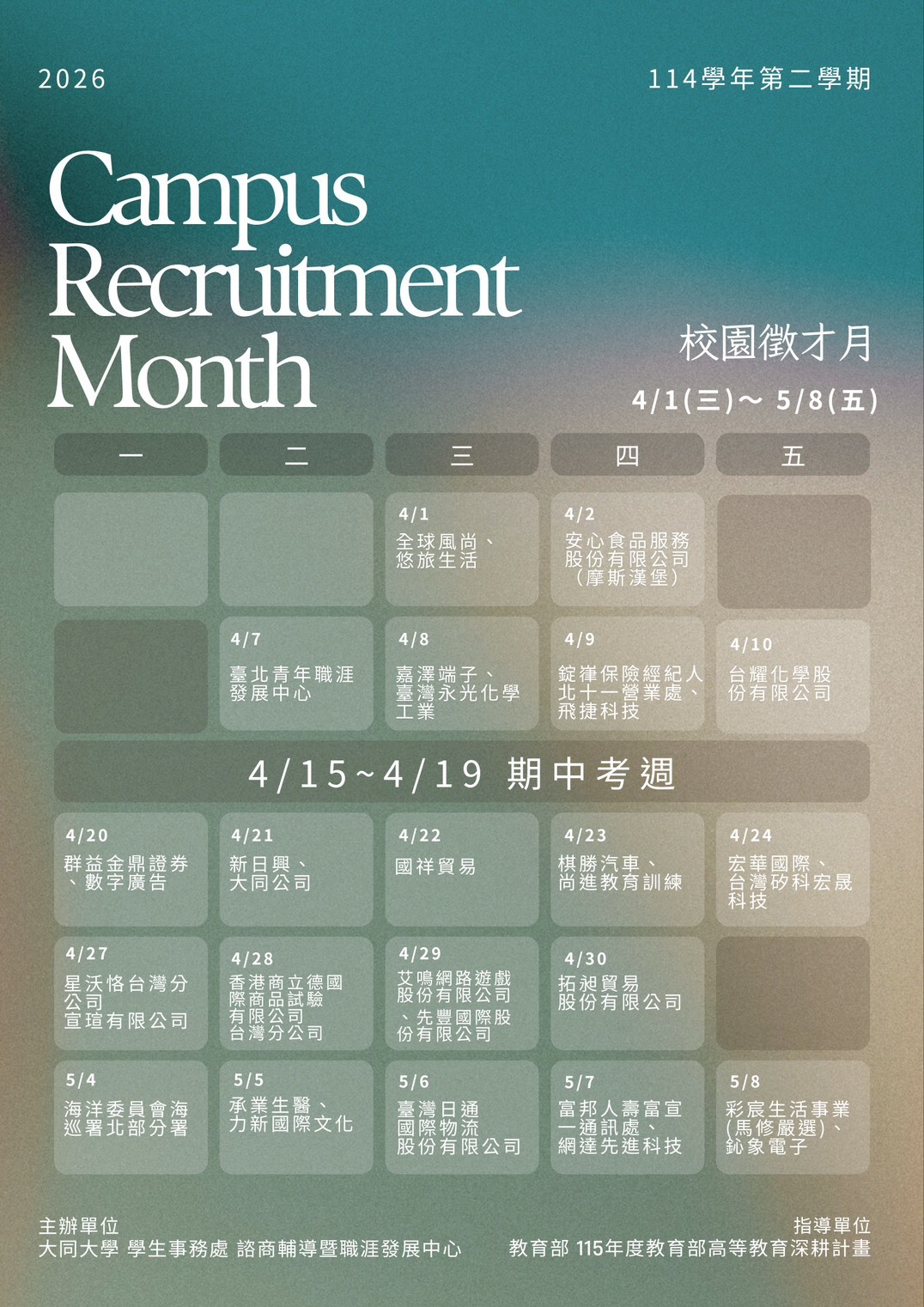 【活動訊息】115年校園徵才月開跑!歡迎同學們踴躍參與,積極了解市場需求!(駐地廠商持續更新中)